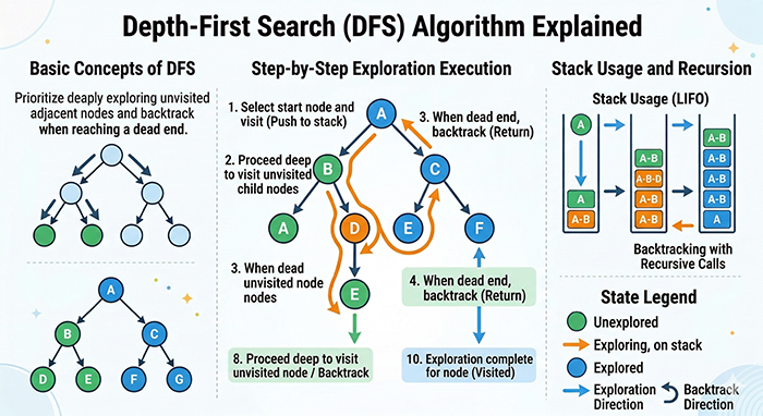 - DFS explores a graph by going as deep as possible before back‑tracking.