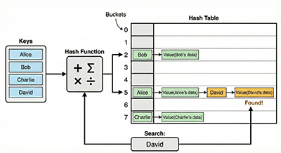 - Collision: Different keys may hash to the same index, causing a “collision”.