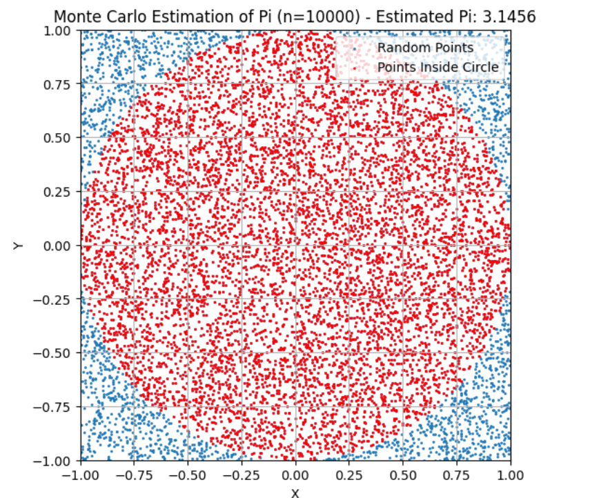 xandycan be considered as coordinates of points randomly falling within a square with side length 2. - Points whose distance from the origin (0, 0) is less than or equal to 1 are inside a circle with radius 1.
