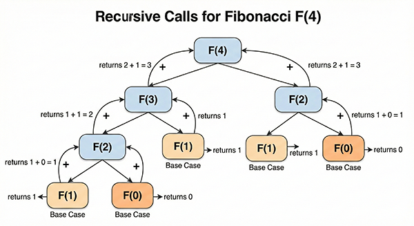 - Otherwise, calculate F(n-1) + F(n-2) by calling the function itself.